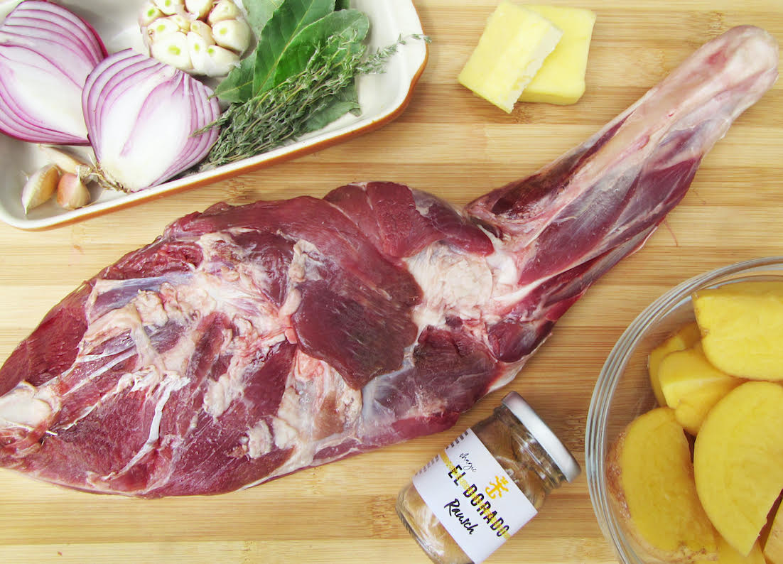Derrita la mantequilla en el microondas y mézclela con el Rub EL DORADO By Rausch y la sal. Unte bien el brazo de cordero con este rub húmedo, y deje reposar durante una o dos horas en refrigeración. En una bandeja para hornear ponga los vegetales, el laurel y el tomillo, y acomode encima el cordero marinado. Tape con papel de aluminio y lleve al horno precalentado a 180º C durante 45 minutos. Al cabo de este tiempo, retire el papel de aluminio, ponga las papas debajo del cordero y devuelva al horno durante 30 minutos más. Con una brocha de cocina pinte la superficie del cordero con los jugos de la cocción. Deje reposar durante 10 minutos antes de cortar.